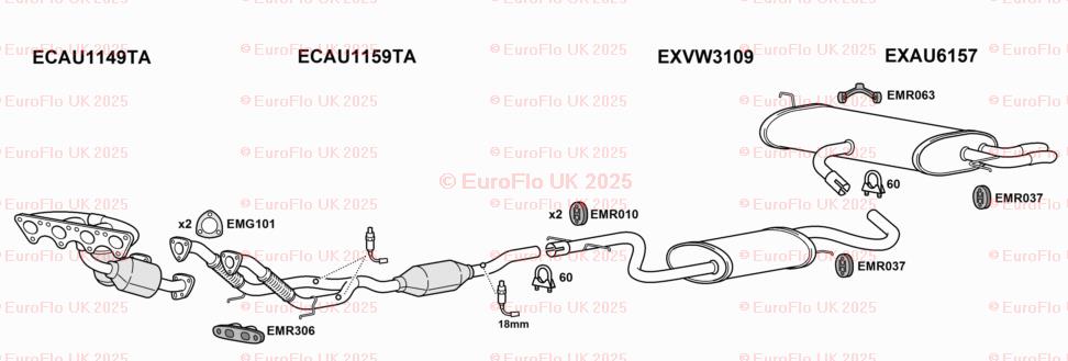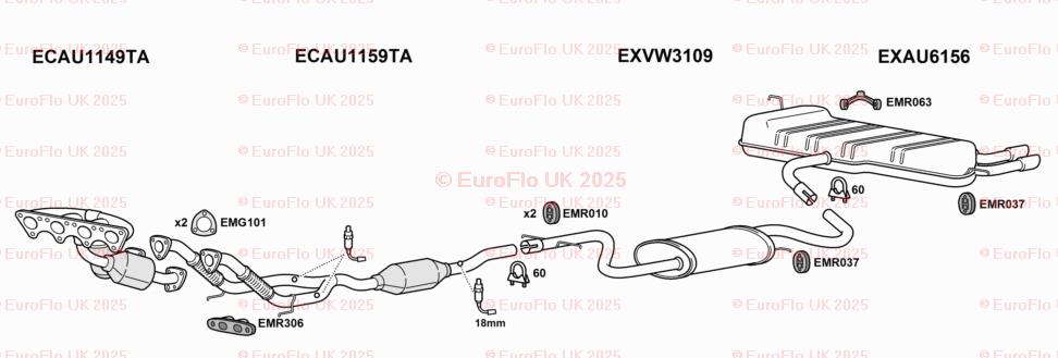The product is a front down pipe upper CAT section exhaust gasket specifically designed for Audi A3 8P models with a 2.0 engine. Manufactured by EuroFlo in the United Kingdom, this exhaust clamp is a high-quality replacement part for the rear of the vehicle. With reference OE/OEM numbers from reputable brands such as BOSAL and KLARIUS, this gasket ensures a secure and efficient exhaust connection for improved performance and emissions control.