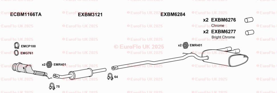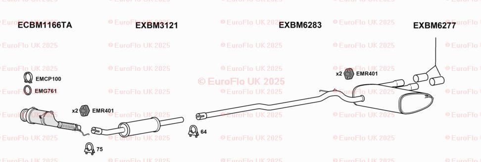 The product is a front down pipe lower exhaust clamp specifically designed for BMW Mini 2.0 Models F55, F56, and F57. Made by Euroflo, the manufacturer part number is EMC075S and the EAN is 5057496500649. This rear placement exhaust clamp is a genuine part manufactured in the United Kingdom, ensuring a precise fit and high quality. The item comes with a clamp included and is not a classic part or a performance part, providing a reliable and essential component for the vehicle's exhaust system.