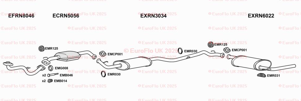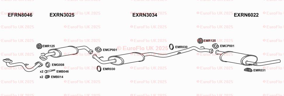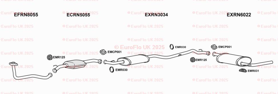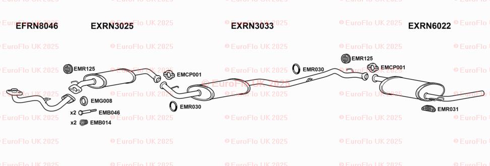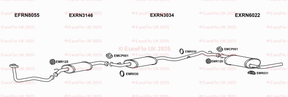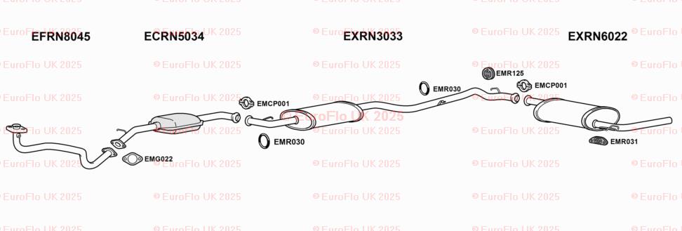 The product is a rear silencer back box rubber hanger support designed specifically for Renault Trafic MK1 models. EuroFlo brand ensures quality and reliability. This complete exhaust system includes a gasket, pipe, and silencer, providing everything needed for the lower rear placement on the vehicle. The manufacturer part number CCPEMR030 helps ensure compatibility and a perfect fit for your vehicle.