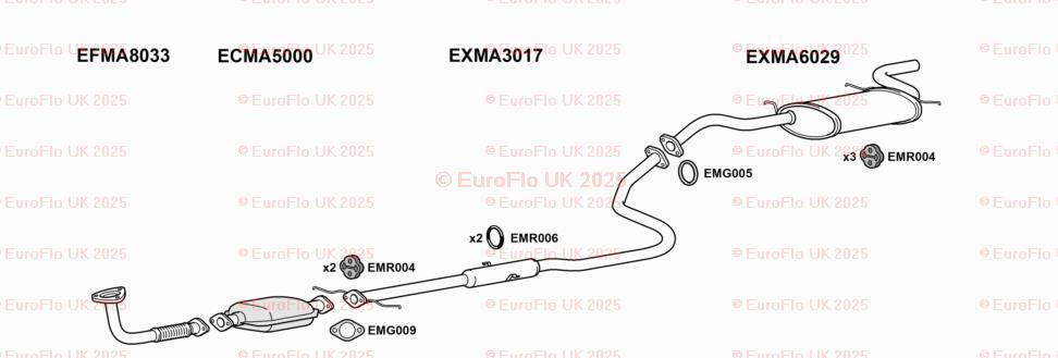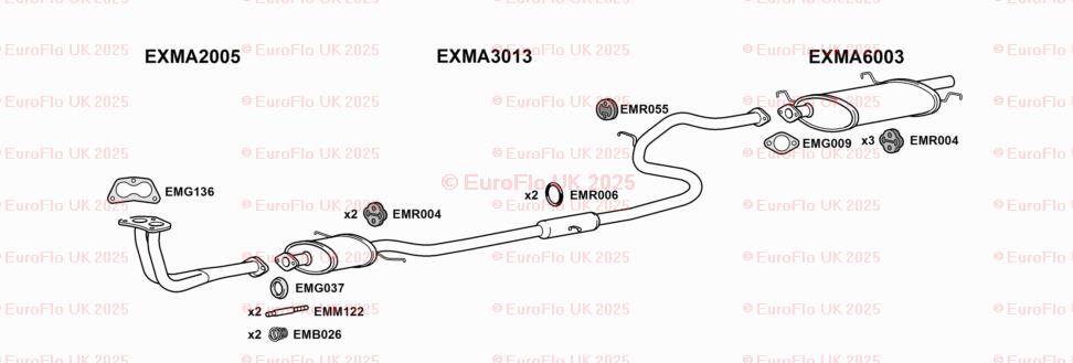 The product is a set of 2 round hanger supports designed for Mazda 121 DA & 323 BW models. Made by EuroFlo in the United Kingdom, these exhaust rubber mounting hangers are 100g in weight and come with a hanger included. The manufacturer part number is EMR006, and these hangers are not modified or custom. They are essential components for supporting the exhaust system of the vehicles.