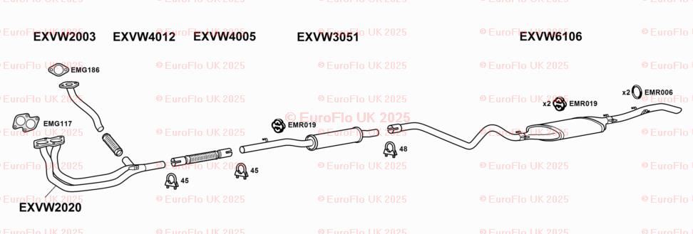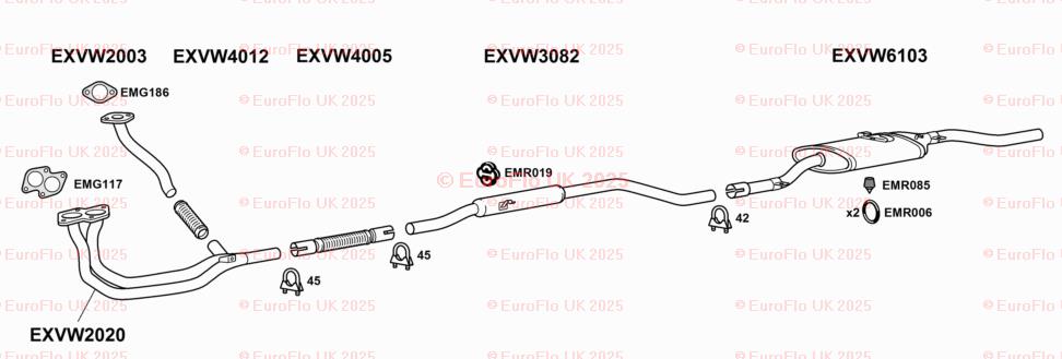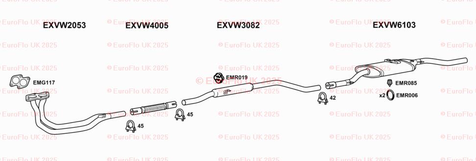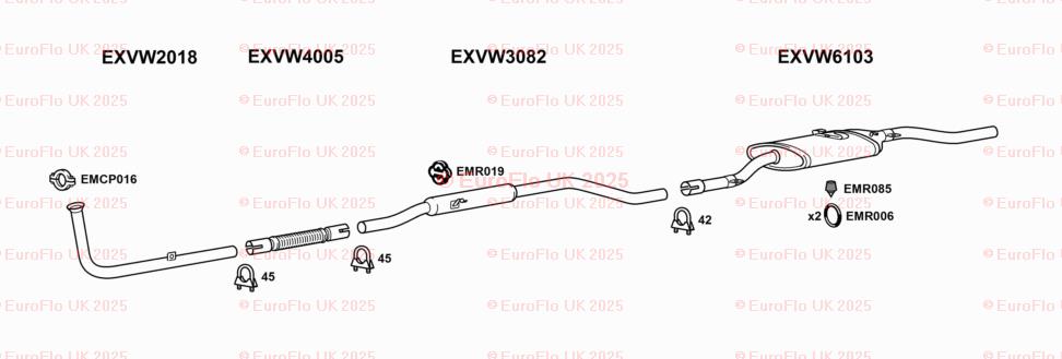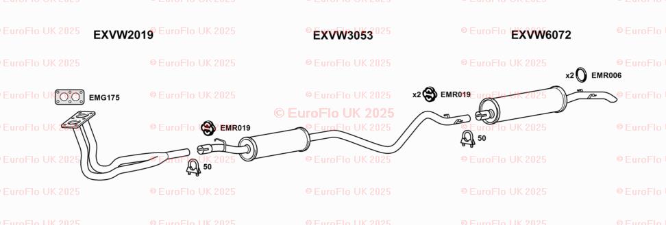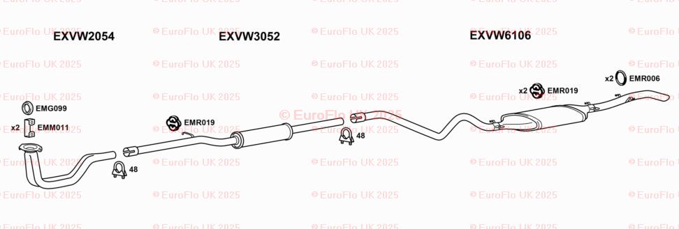 The product is a set of two Volkswagen Derby & Jetta models exhaust rubber mounting round hangers from EuroFlo. These hangers are made in the United Kingdom and are designed to support the exhaust system of the vehicles. The hangers are manufactured by EuroFlo and are 100g in weight. They come with the manufacturer part number EMR006 and include the necessary hardware for installation. These hangers are not modified items and are not considered classic parts.
